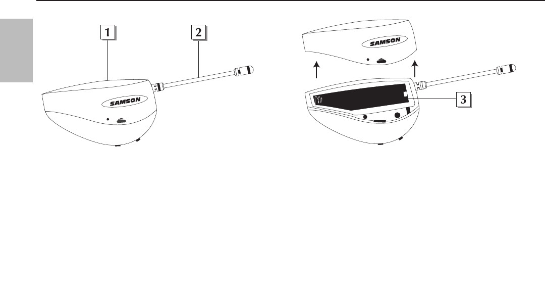 3: Battery compartment - Insert a standard AAA alkaline battery here, being sure to observe the plus and minus polarity markings shown. We